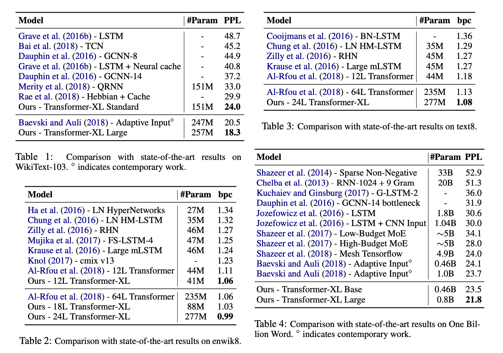 * 또한 최근 보조 손실(auxiliary losses)과deep transformer network를 통해 LSTM 성능을 크게 능가하는 character-level LM이 개발된 바 있다(관련 논문 : https://arxiv.org/abs/1808.04444). 하지만, 이 논문에서는 fixed context length의 segment를 사용했기 때문에 fixed length(사전에 정해놓은 고정길이)를 넘어서는 context의 long-term dependency를 modeling하지 못했다.