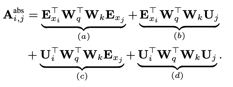 $A_{i,j}^{abs} = (E_{xi}^T + U_i^T) W_q^T ((E_{xj}^T + U_j^T)W_k^T)^T$