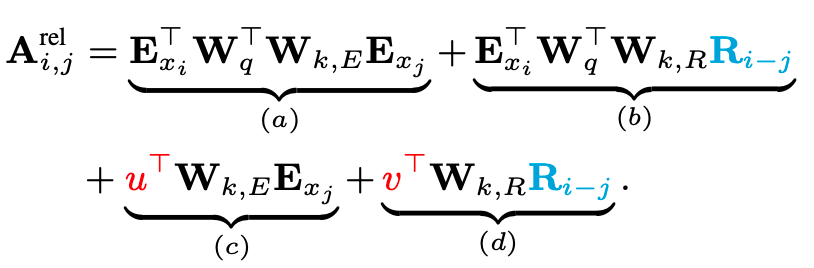 * Attention score 전체를 구하는데는 모든 (i, j)쌍에 대하여 $W^n_{k, R} R_{i-j}$를 구해야 한다.