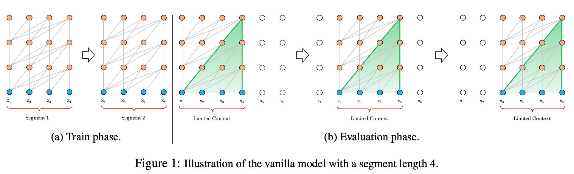 * vanilla model의 evalutation시에는 training시에 문제가 됐었던 context fragmentation문제는 해결된다. 주어진 sequence를 segment단위로 잘라 입력에 사용하는 것이 아니라, window를 하나씩 옮겨가듯 오른쪽으로 1 position씩 옮겨가며 다음 prediction을 시행하기 때문이다.