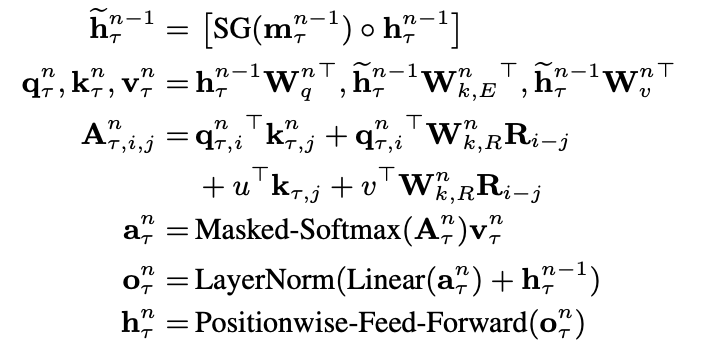 * 이 때 segment $s_{\tau + 1}$의 n번째 layer의 hidden state는 아래와 같이 생성된다.