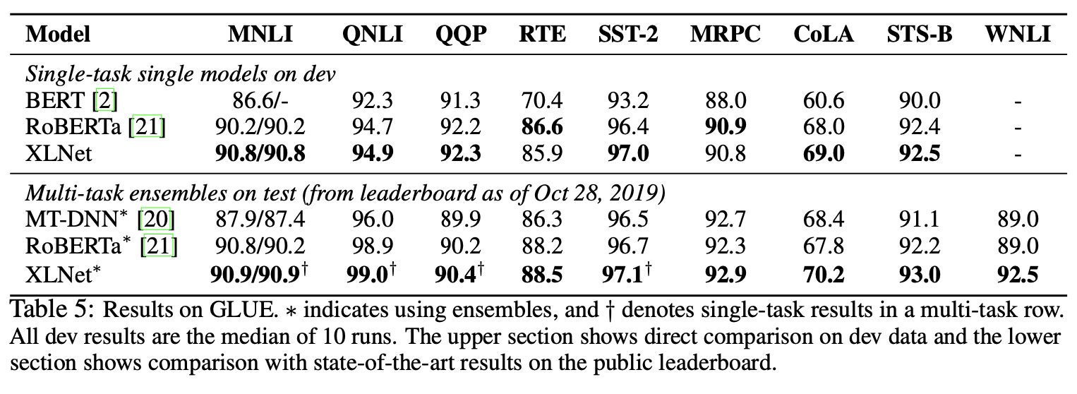 * 두 번째로 위에서 설명한대로 XLNet은 generalized AR model이기 때문에 data corruption에 의지하지 않고, 이에 따라 훈련 데이터와 fine tuning 데이터간의 불일치가 발생하지 않는다. data corruption을 사용하지 않기 때문에 input sequence의 단어들을 모두 사용할 수 있고, BERT에서의 oversimplified consumption인 각 단어들의 등장확률이 독립이라는 가정을 사용하지 않게 된다.