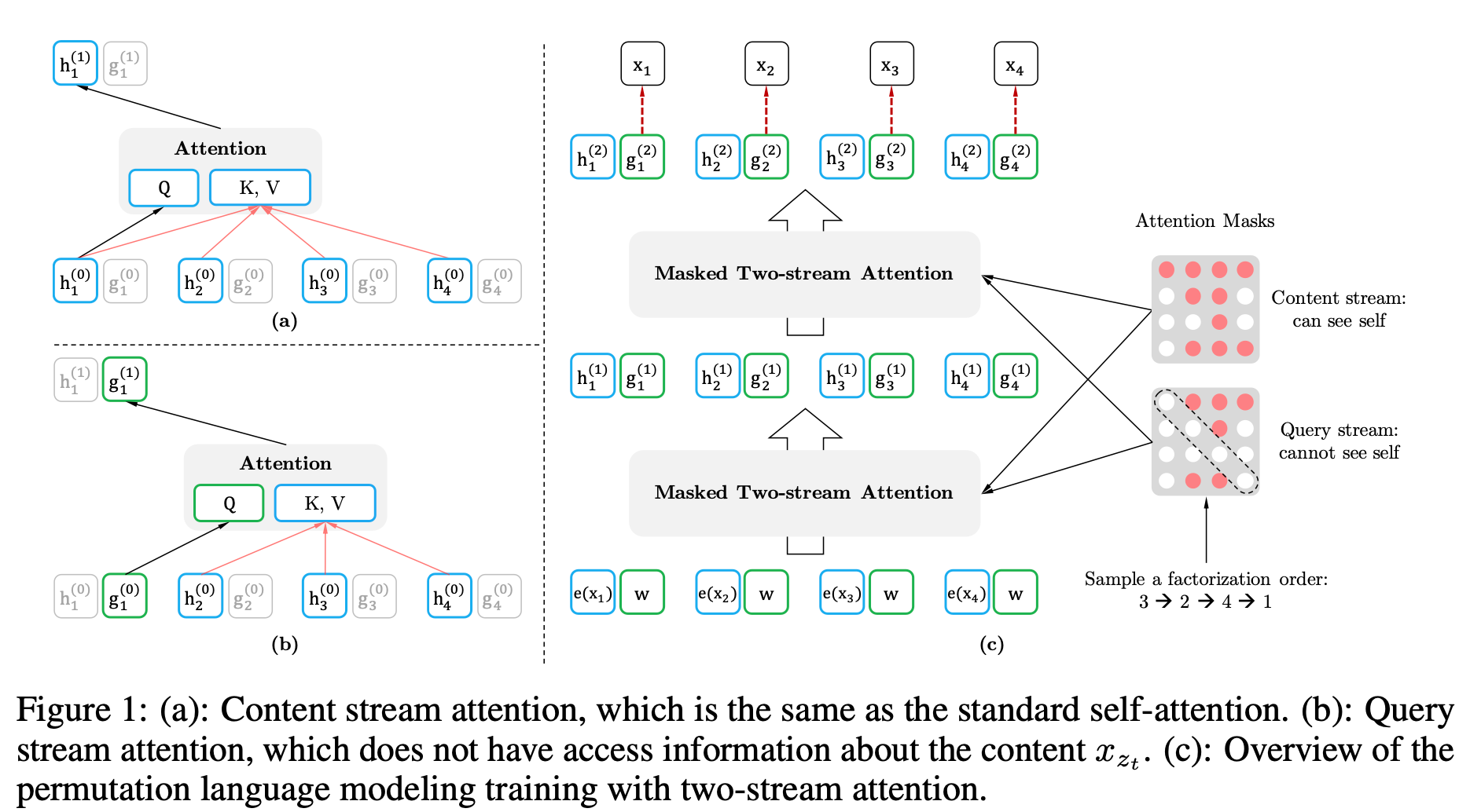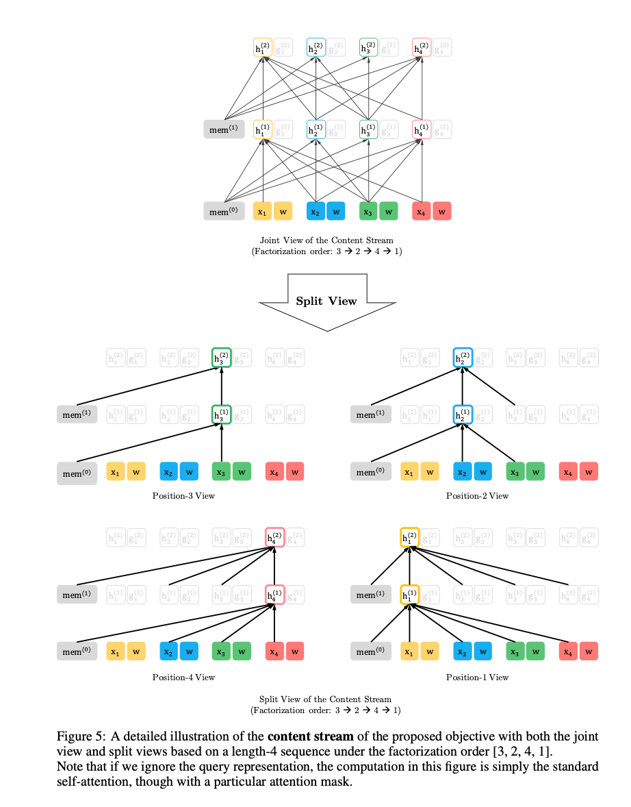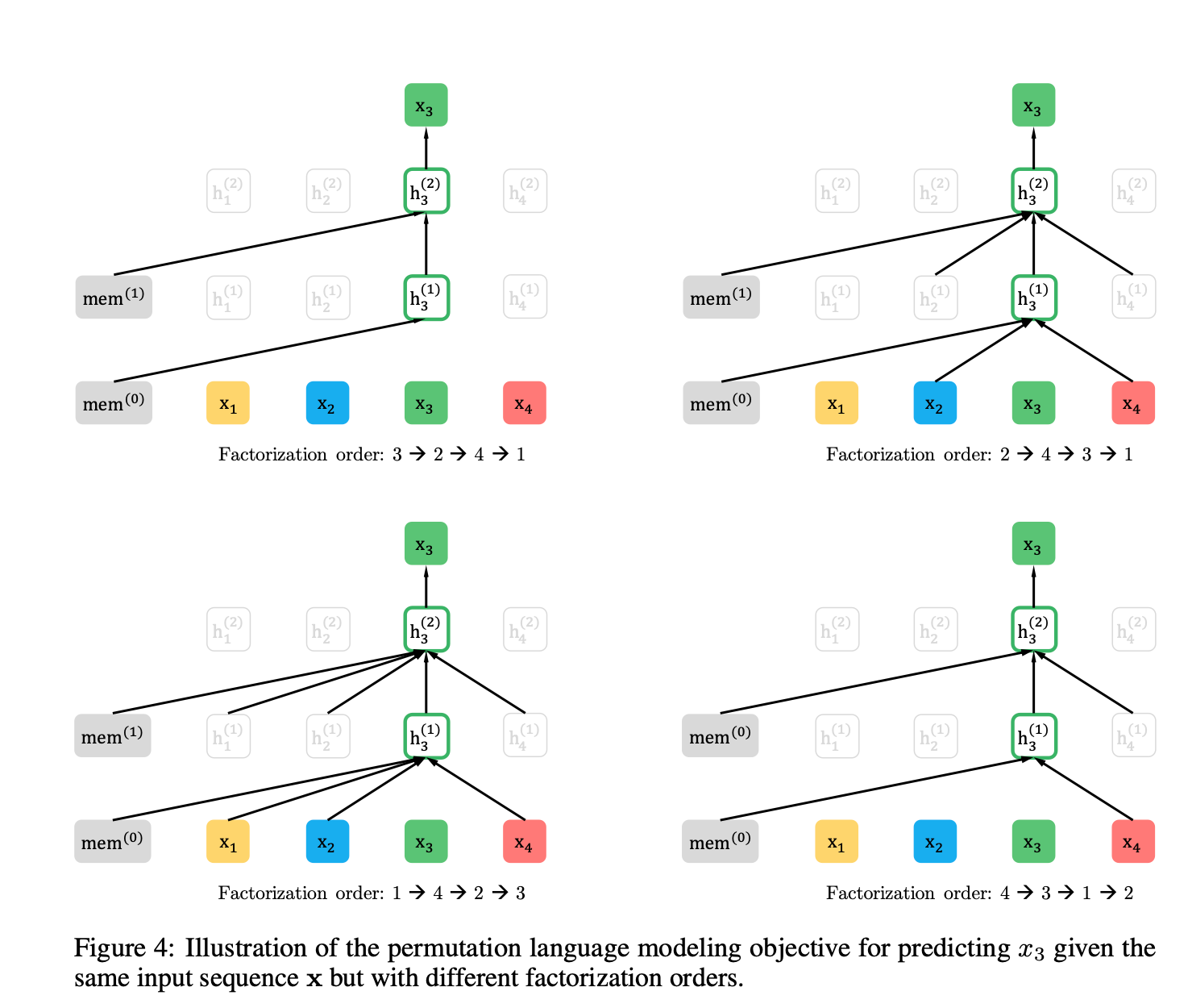 * 위 자료는 $x_3$ token을 예측하는 경우를 표현한 것이다. factorization order에서 $x_3$ 이전에 있는 단어들만 활용해 hidden state를 생성한다. [3,2,4,1]의 경우 3이 가장 앞에 있기 때문에 input sequence의 정보를 전혀 활용하지 않고 memory(이전 segment들의 정보)에 있는 정보만 활용한다. [2,4,3,1]의 경우엔 3보다 앞에 있는 2, 4만 입력으로 사용하는 것을 볼 수 있다.