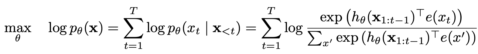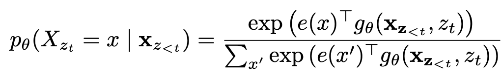 * 예를 들어 다음 token의 확률분포 $p_\theta (X_{z_t} | x_{z_{<t}})$를 softmax formulation $p_{\theta} (X_{z_t} = x | x_{z_t}) = {exp(e(x)^T h_\theta (x_{z_{<t}})) \over \sum_{x'} exp(e(x')^T h_\theta (x_{z_{<t}}))}$ 를 통해 parameterize한다고 해보자.