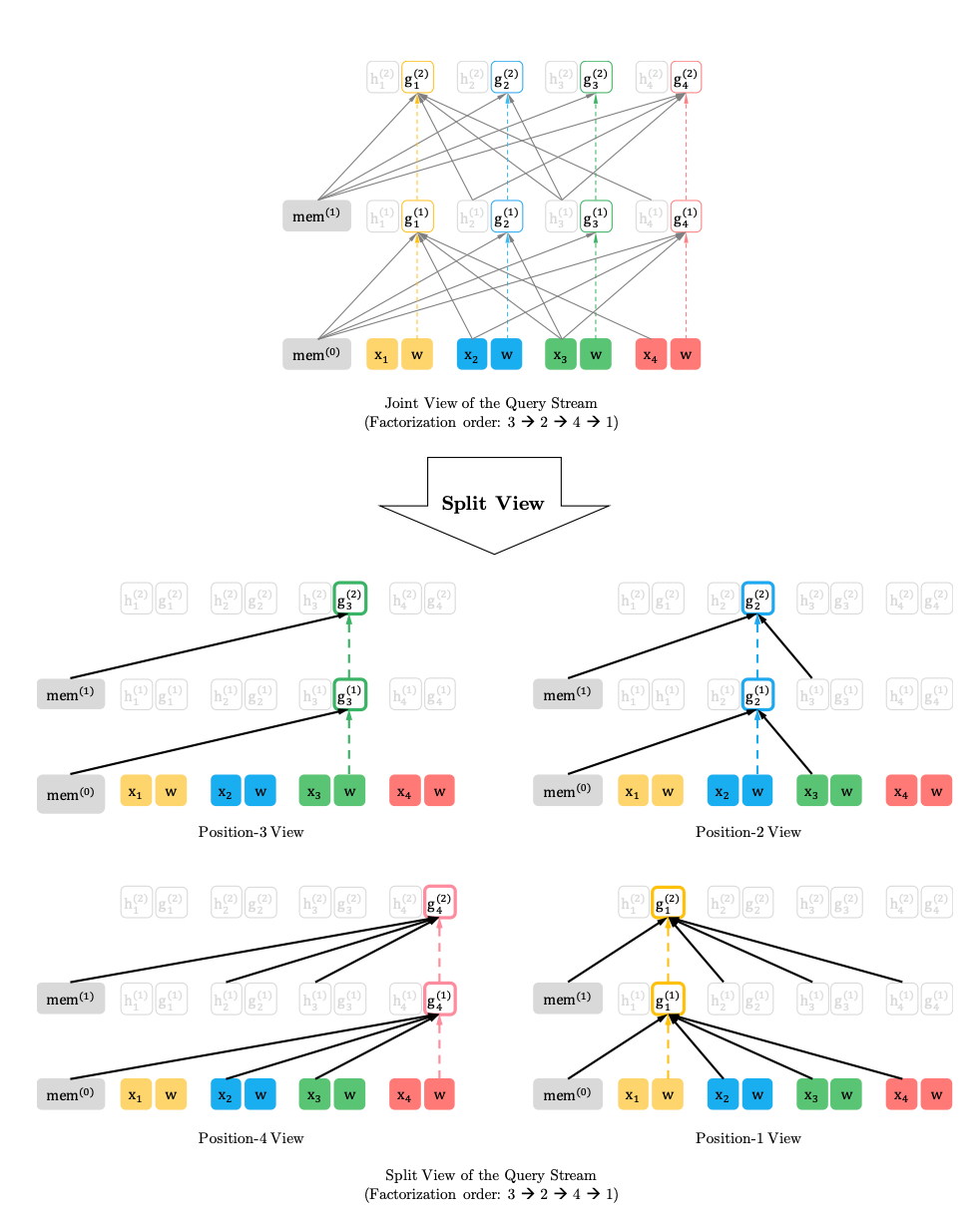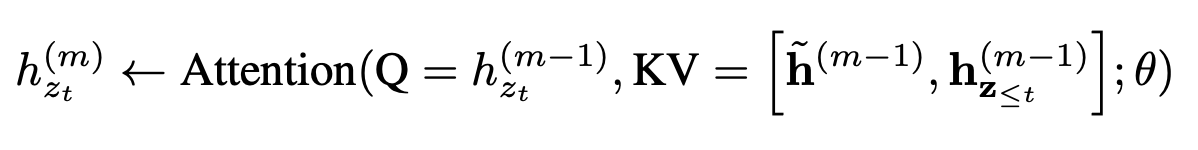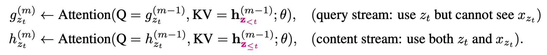 * content stream은 모든 position $z_t$에서 memory를 사용하고, 각 position까지 포함한 token들을 attention의 입력으로 사용하게 된다.