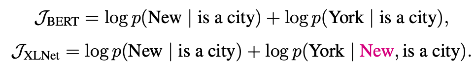 * 반면 XLNet은 York에 해당하는 확률 계산시 앞서 등장한 New token까지 고려하기 때문에 BERT와 달리 New에 해당하는 조건부 확률과, York에 해당하는 조건부 확률은 다르게 된다.