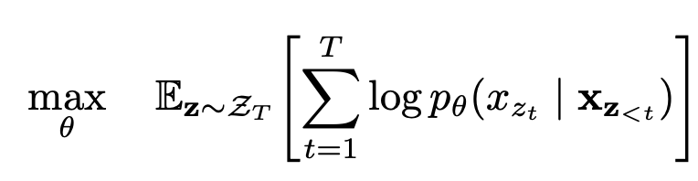 * 만약 sequence x의 길이가 T라면(T 개의 단어가 들어있는 문장), $T!$ 개의 각기 다른 순서쌍을 통해 autoregressive factorization을 수행할 수 있다.