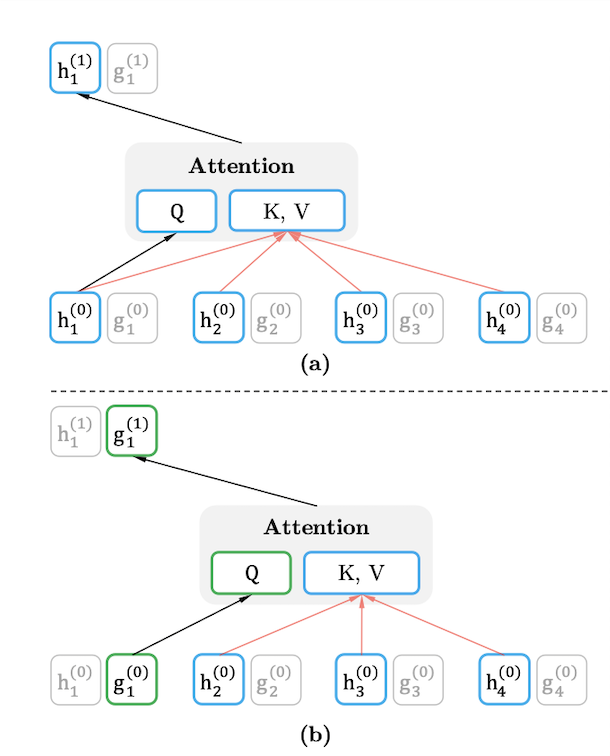 * content stream에서는 K와 V를 생성할 때 t시점의 token까지 사용하기 때문에 t 시점의 position 정보와 token 정보를 사용할 수 있다. 즉, standard self-attention과 계산 과정이 동일하다.