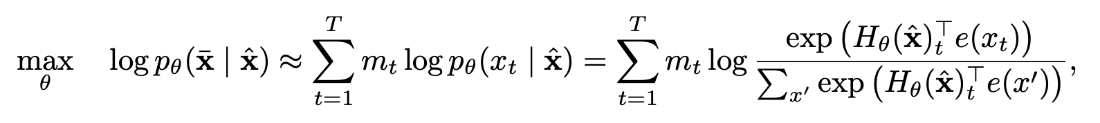 * $m_t = 1$ 이라면, $x_t$ 즉, t번째 token이 masked되어 있다는 뜻이고, $H_\theta$는 text sequence x를 hidden vector $H_\theta (x) = [H_\theta(x)_1, H_\theta(x)_2, ... , H_\theta (x)_T]$로 mapping 해주는 Transformer를 뜻한다.