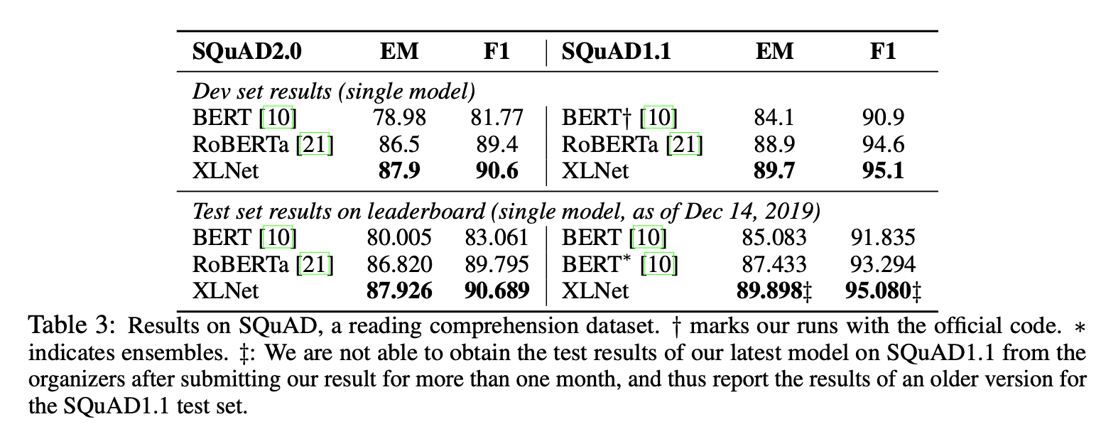 * BERT는 각 단어에 absolute segment embedding(A, B 중 어떤 segment에 속하는지)를 부여하지만, XLNet은 이러한 segment embedding 방식을 relative 하게 부여한다.