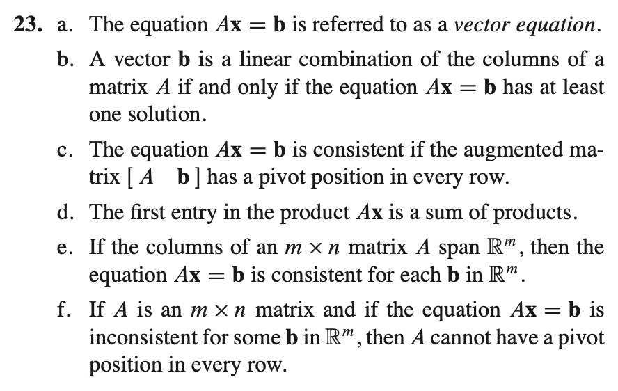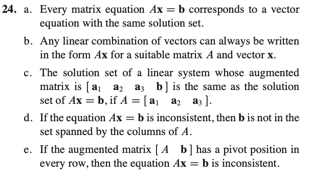 b) linear combination은 Ax 와 같이 matrix equation으로 표현 가능하다 -> True