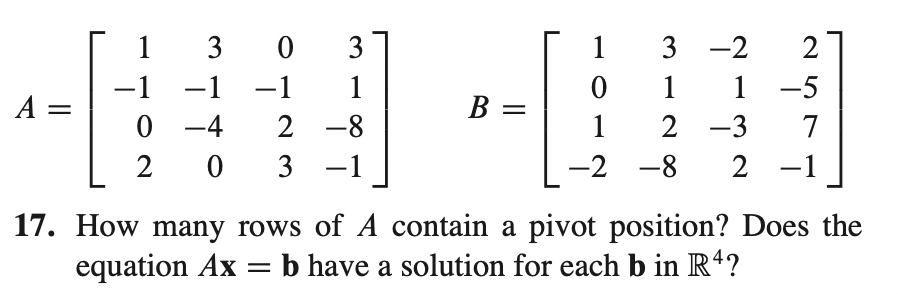 * $b \in \mathbb R^4$ 이기 때문에 b의 모든 element가 nonzero라고 했을 때 pivot position이 존재하지 않은 row는 0=x꼴이 되기 때문에 해당 system의 solution은 존재하지 않기 때문이다.
