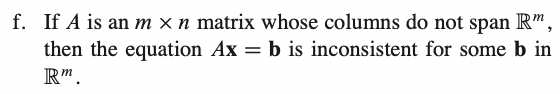 f) 모든 $b \in \mathbb R^m$에 대해 consistent하기 위해서는 matrix A가 $\mathbb R^m$을 span해야 한다. -> True