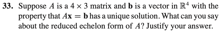 c) 주의해야 될 점은 matrix A의 coefficient matrix의 모든 row에 pivot이 존재해야 한다는 점이다. 만약 c번의 예 처럼 [A b]와 같은 augmented matrix가 주어진다면 pivot이 존재한다는 의미가 coefficient matrix에서 논의하던 개념과는 조금 달라진다. -> False