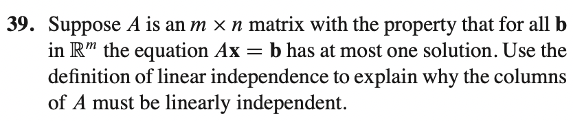 * 모든 b에 대해 최대 1개의 solution이 존재한다고 했다. 이에 다라 b=0일 때도 최대 1개의 solution이 존재(정확히 말하면 Ax = 0이 no solution을 가질 순 없으니, 1개의 solution이 존재하게 된다)하게 되는데 이 때 1개의 solution을 가진다는 것은 trivial solution을 가진다는 것과 같고, 이 경우 A의 column들이 linearly independent하다.