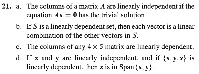 b) entry의 개수가 n이고, vector의 개수가 p일 때 p > n이라면 variable의 개수보다 column의 개수가 많기 때문에 모든 column에 pivot이 존재할 수 없고, 이에 따라 homogeneous system의 solution이 nontrivial이 되어 linearly dependent한 것은 맞다. 하지만, 반대로 n > p 이라고 무조건 linearly independent한 것은 아니고, free variable이 존재하지 않아야 가능하다. -> False