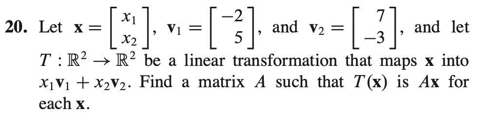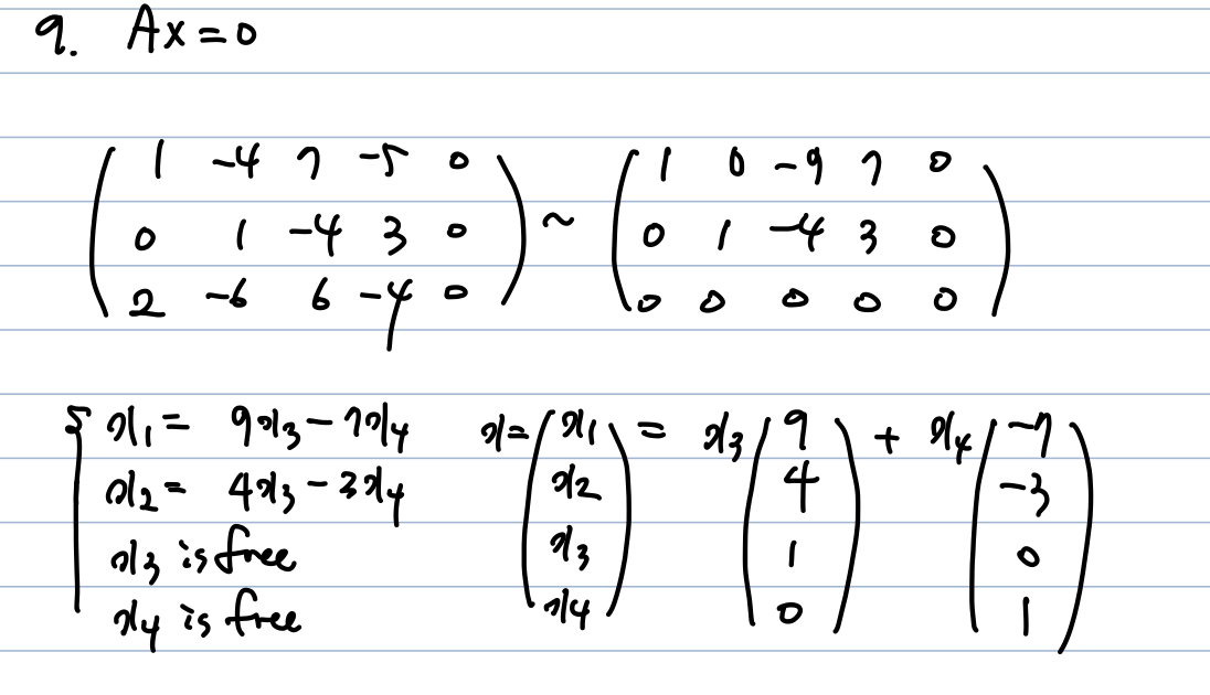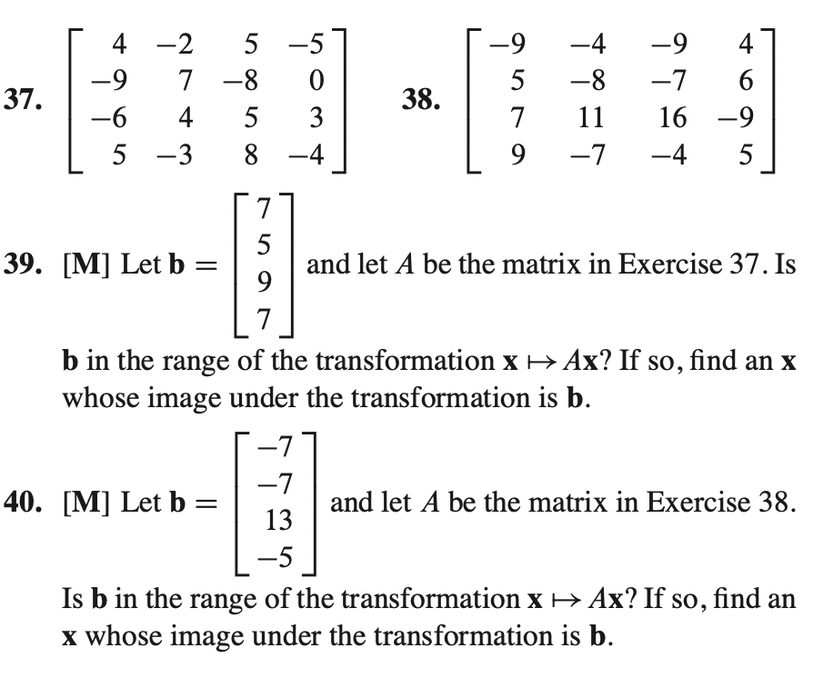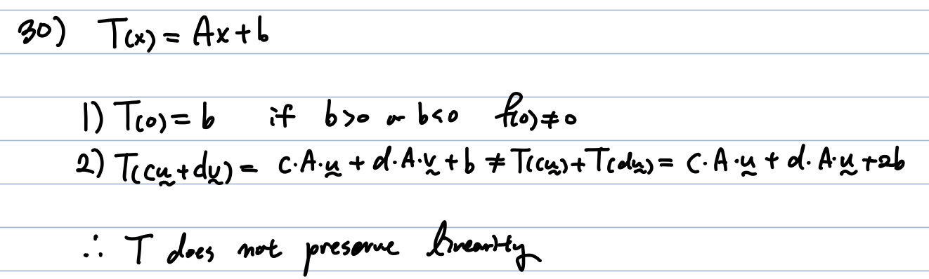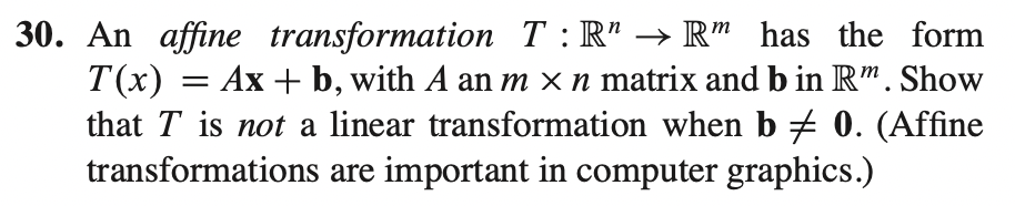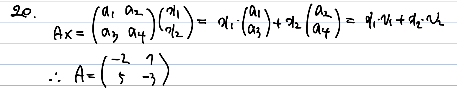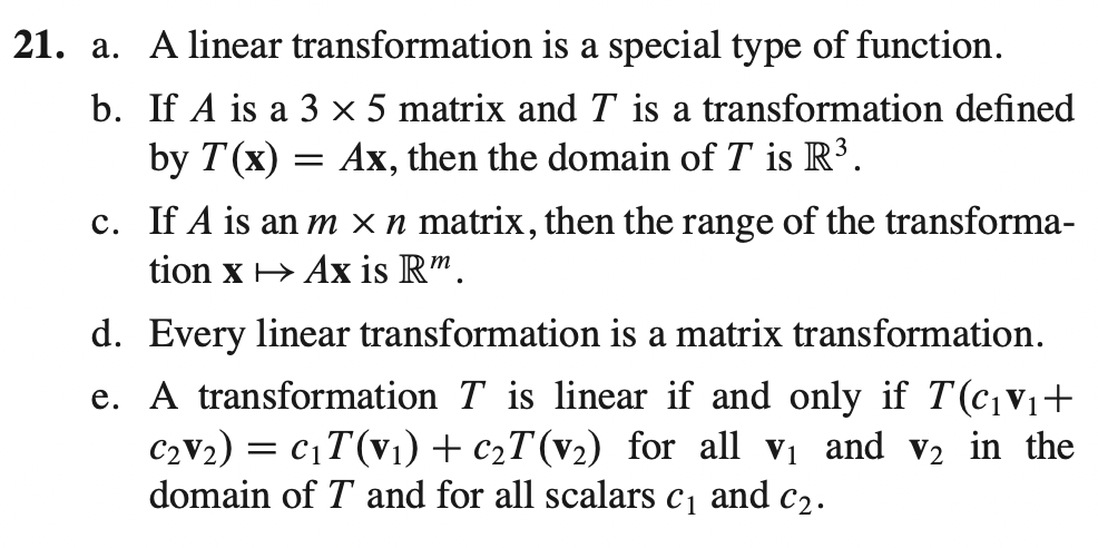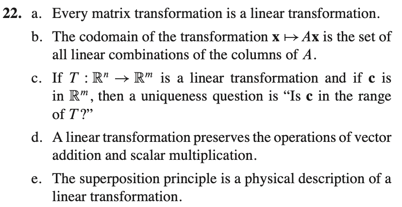 b) matrix A가 m x n 크기를 가질 때, A의 column들의 linear combination 결과는 m차원의 벡터이다. 하지만, Ax 의 결과벡터는 n차원 실수공간에 속하므로 명제는 참이 아니다. -> False