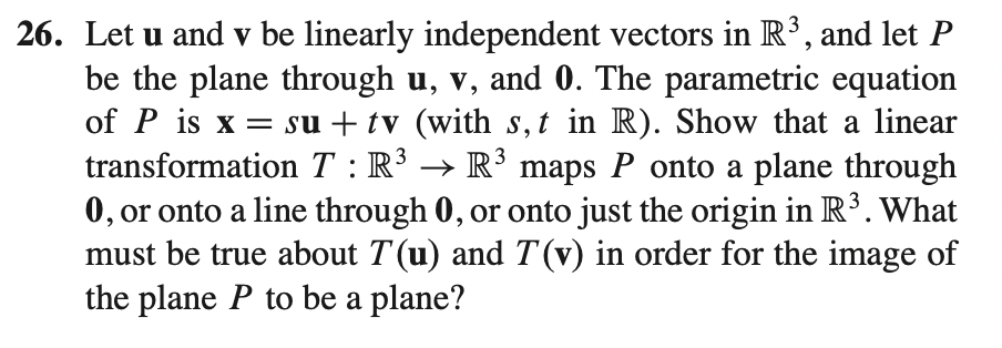 * 두 벡터가 선형독립일 경우 T의 image는 span{T(u), T(v)}인 origin, T(u), T(v)를 지나는 plane이 된다.