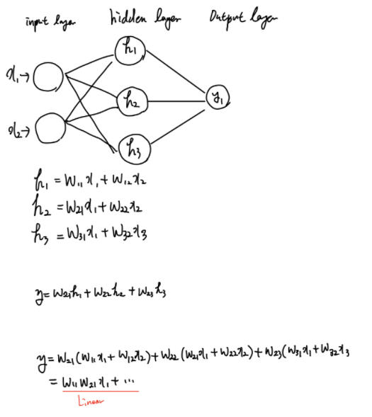 - h1, h2, h3는 각각 같은 층에 속해있는 neuron이고 선형 함수를 activation function으로 가지고 있다.
