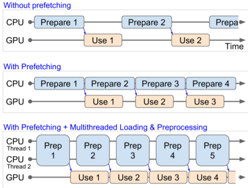 prefetch(1)사용하면 CPU가 GPU에게 작업할 배치를 넘겨준 직후 바로 다음 배치에 대한 준비를 시작하게 된다. 이를 통해 전체 작업속도가 단축될 수 있다.- 또한 num_parallel_calls를 통해 여러개의 스레드를 생성해 데이터를 적재하고 전처리하여 GPU의 작업 시간보다 빠른 시간 안에 데이터에 대한 준비를 끝낸다면 GPU의 작업이 끝나는 즉시 다음 배치를 넘겨줄 수 있기 때문에 GPU를 100%활용할 수 있다.