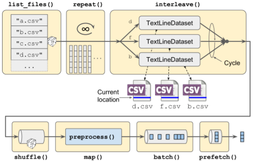 shuffle()이 이용될 수도 있지만, 원본 데이터를 여러개의 파일로 나누고 훈련시 무작위로 읽는 방법이 많이 사용된다.