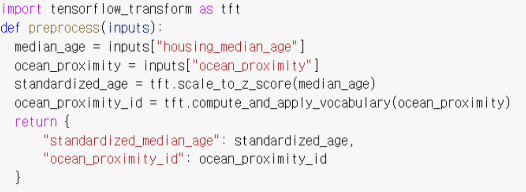 - TF변환은 전처리 연산을 한 번만 수행하기 때문에 훈련 서빙 왜곡과 같은 현상이 일어나지 않고, 층을 동적으로 추가할 때의 단점도 상쇄할 수 있다는 장점이 있다.