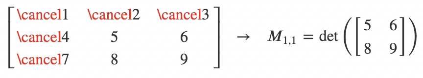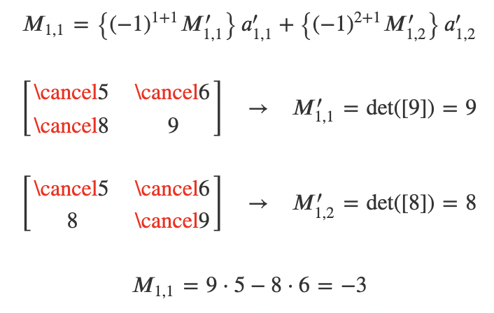 * 원소 앞에 있는 수식은 가중치로 $M_i,j$는 minor(소행렬식)이라고 부르는 i행과 j열을 지워서 얻어진 행렬의 행렬식이다. 이 행렬의 경우 원래의 행렬보다 크기가 1이 작게 된다.