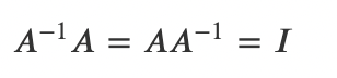 4) 역행렬 $A^-1$은 원래의 행렬 A와 다음 관계를 만족하는 정방행렬을 말한다. I는 항등행렬이다.