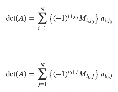 2) 행렬 A가 scalar가 아니라면 여인수 전개(confactor expansion) or 라플라스 전개(Laplace expansion)라고 불리는 다음 식을 이용해 계산한다.