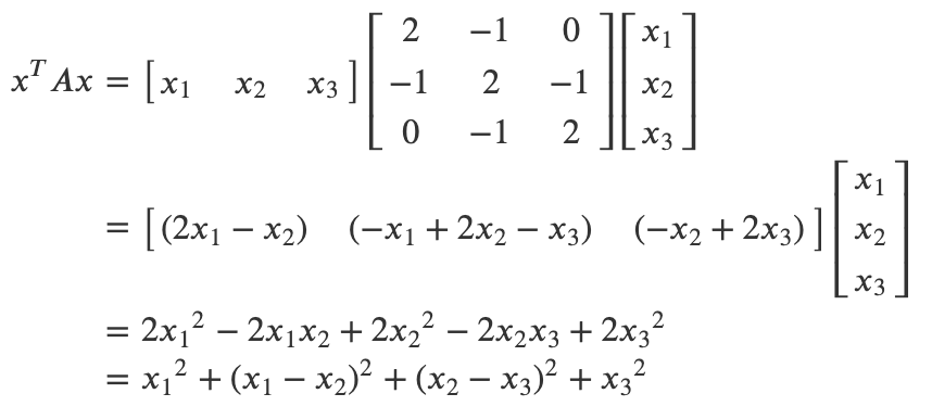 * 이 값은 x가 영벡터인 경우를 제외하고는 항상 0보다 크다. 이 경우 행렬 A는 양의 정부호에 해당한다.