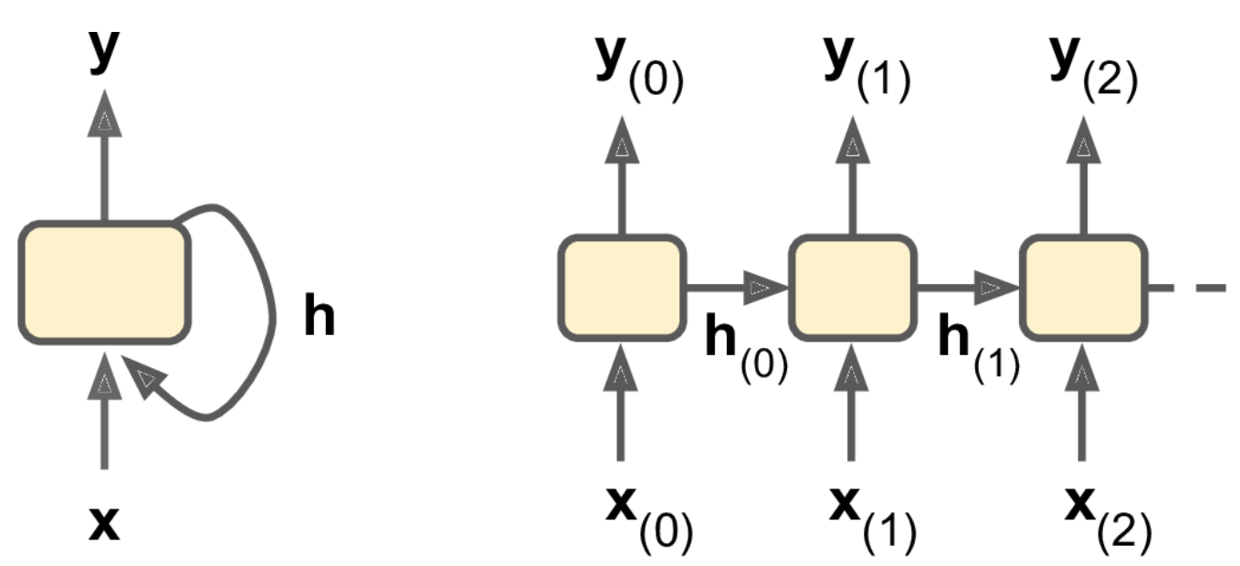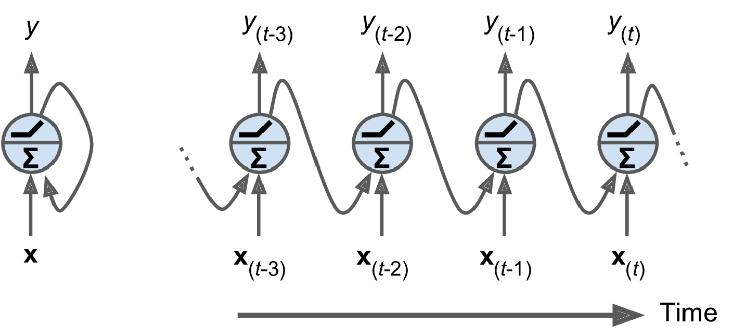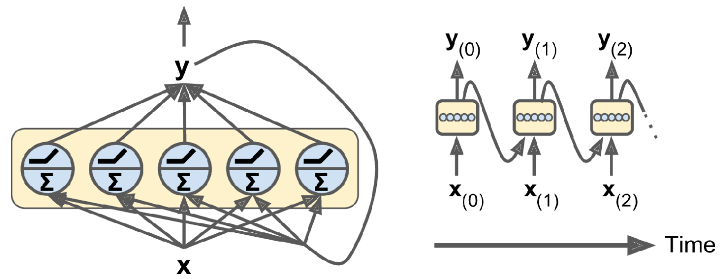 * 위 그림의 왼쪽 뉴런 한 개로 구성된 모형은 가장 간단한 RNN 모형이다. 이를 시간 축으로 표현하면 오른쪽 그림과 같이 표현할 수 있다.