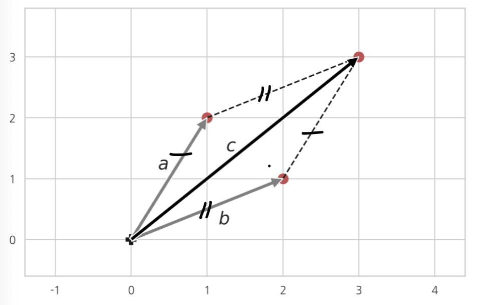 * 두 벡터의 합은 두 벡터를 이웃하는 변으로 가지는 평행사변형의 대각선을 나타내는 벡터가 된다.