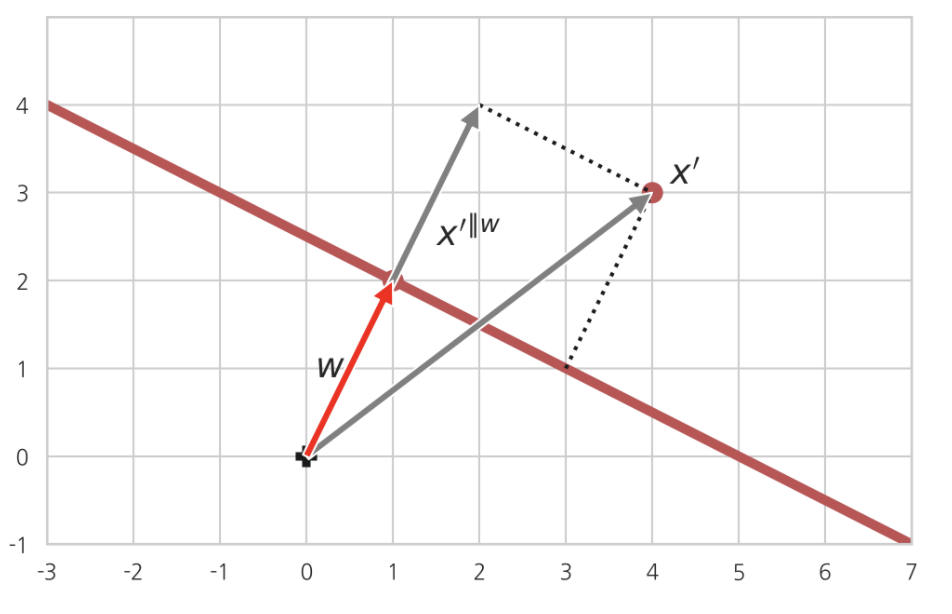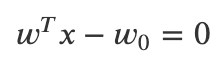 * 위에서 도출된 방정식은 그림의 직선의 방정식과 같다. 이 직선과 원점 사이의 거리는 $||w||$이다.