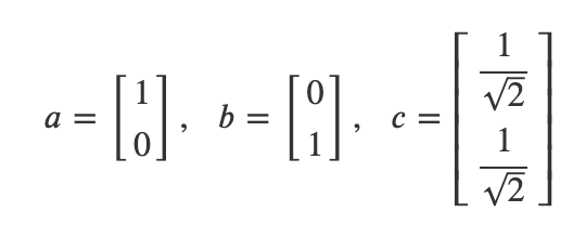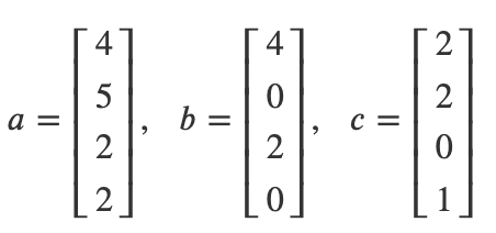 a, b, c, 3명의 사용자가 4개의 영화에 준 평점을 다음처럼 벡터로 표현하였다.