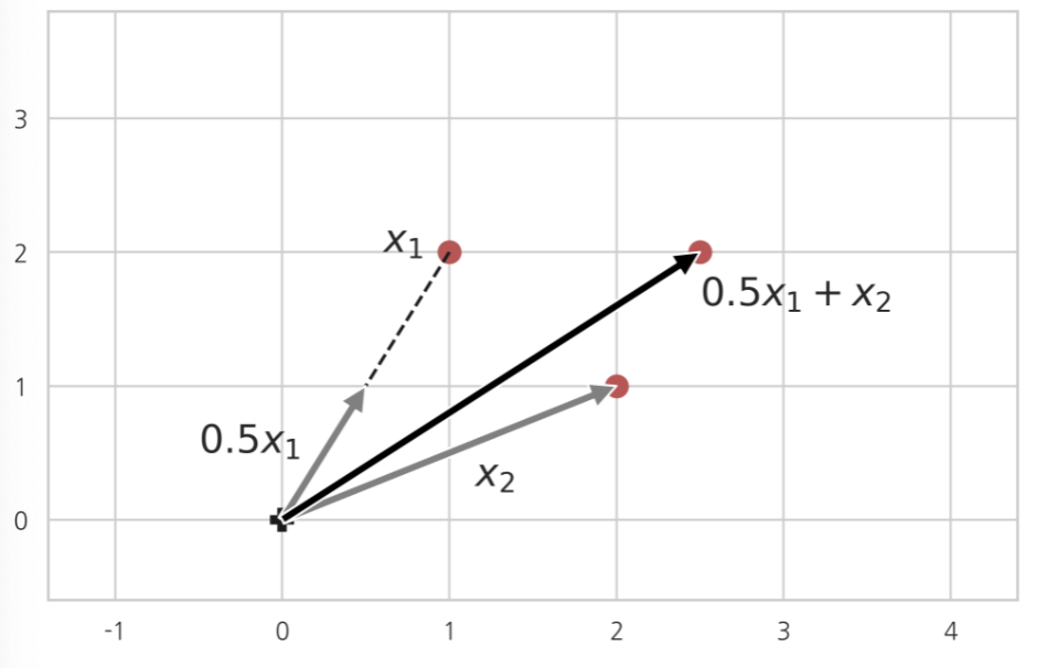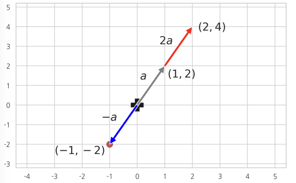 * 양의 실수와 벡터를 곱하면 벡터의 방향이 변하지 않고 길이가 실수배가 된다.