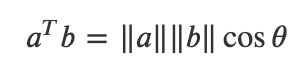 * 두 벡터의 내적은 벡터의 길이와 두 벡터 사이의 각도 $\theta$의 cosine함수 값으로 계산 가능하다.