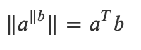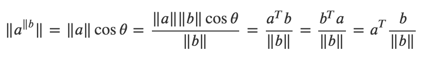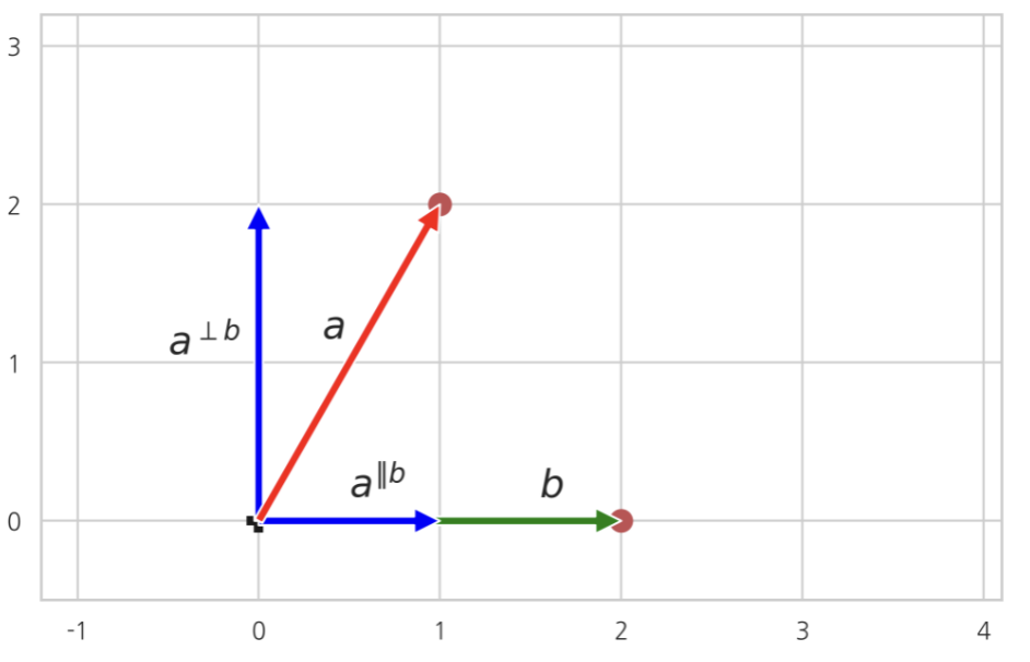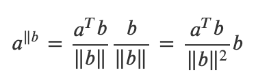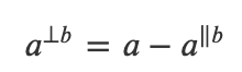 * 벡터 a를 다른 벡터 b에 평행한 성분(투영성분(projection), $a^{||b}$)과 벡터 b에 직교하는 성분(직교성분(rejection), $a^{\perp b}$)으로 분해할 수 있다.