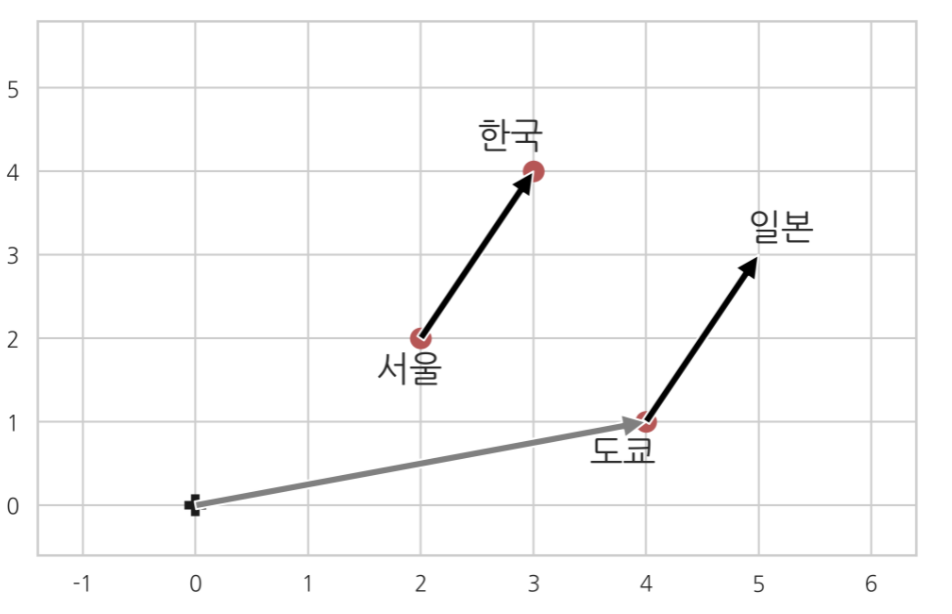 * 도쿄는 $\begin{bmatrix} 4 \\ 1\end{bmatrix}$ 이다. 도쿄 + (한국 - 서울) = $\begin{bmatrix} 5 \\ 3\end{bmatrix}$으로 일본이 된다.