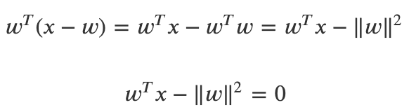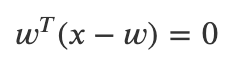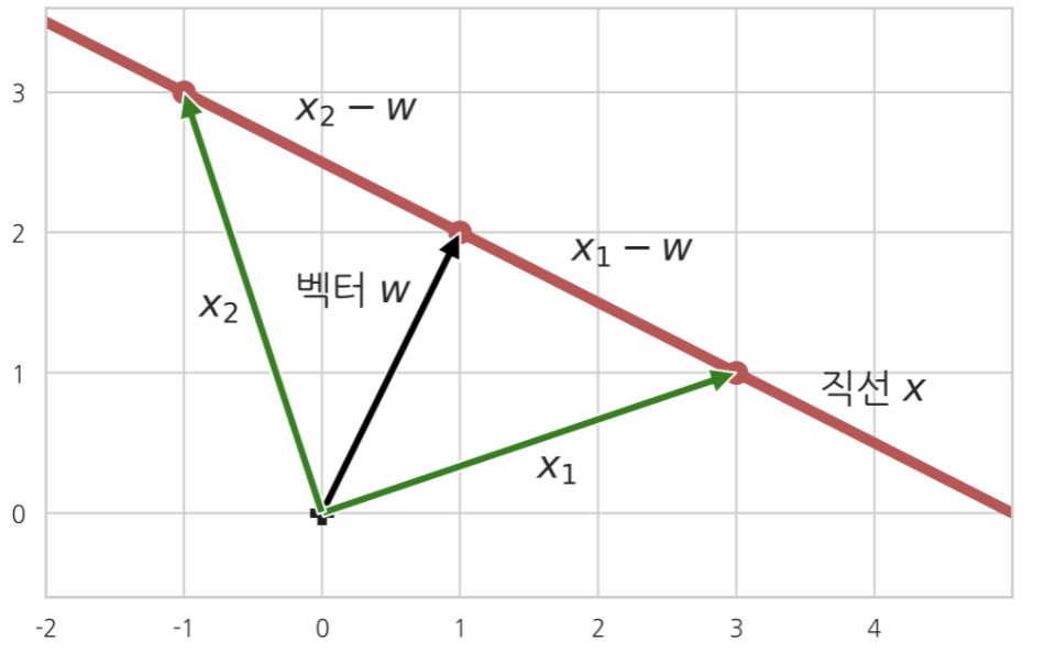 * 두 조건을 만족하는 직선 상의 임의의 점을 가리키는 벡터를 x라고 했을 때, x가 가리키는 점과 w가 가리키는 점을 이은 벡터 x-w는 w와 직교하게 된다. 직교하는 두 벡터의 내적은 0이므로 다음과 같다.