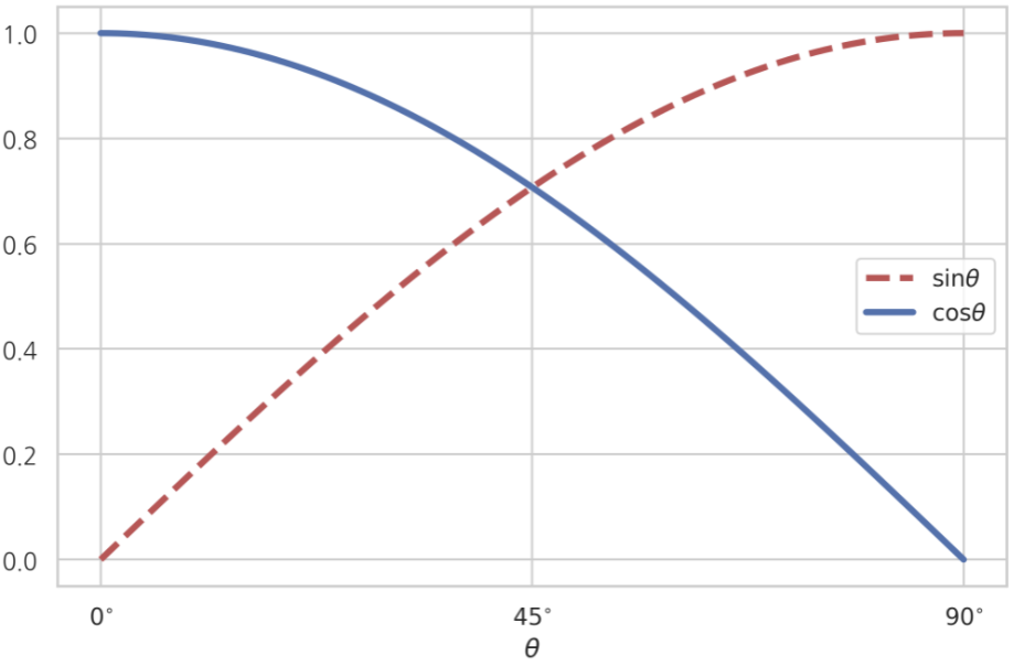 * $cos \theta$의 값은 $\theta$가 0에 가까워질수록 1에 가까워지고 90에 가까워질수록 0에 가까워진다.
