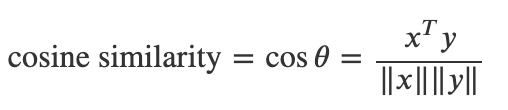 * 코사인 유사도는 두 벡터의 방향이 얼마나 같은지를 나타내는 지표이다. 두 벡터의 방향이 같을 수록 벡터들이 비슷하다고 간주한다.