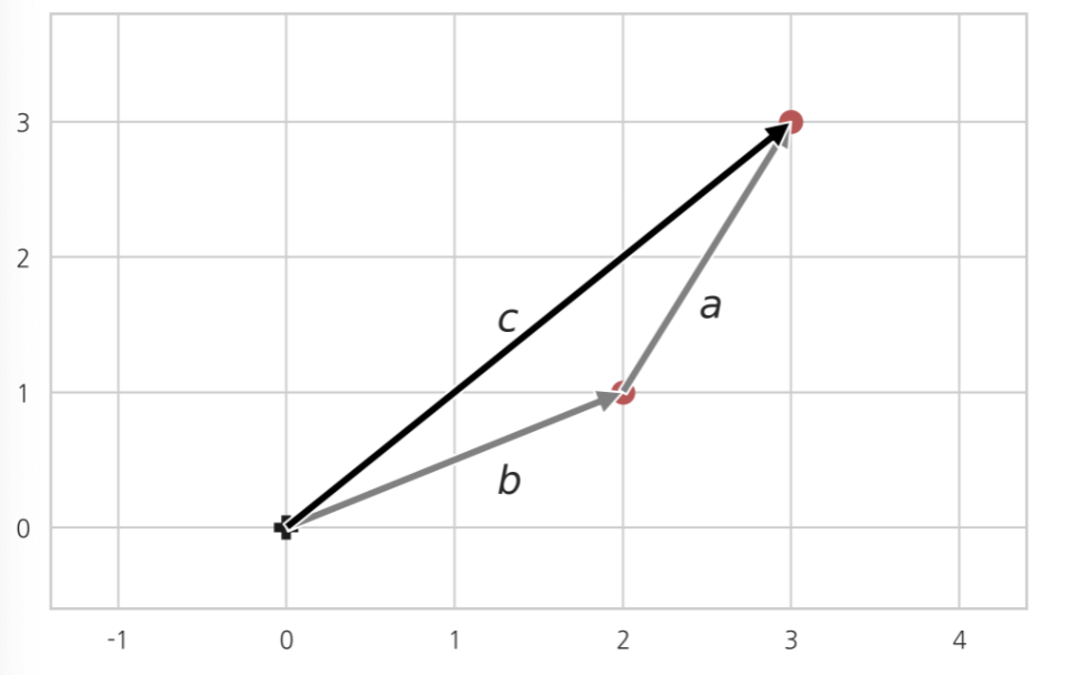 * 벡터의 차 a-b=c 는 벡터 b가 가리키는 점으로부터 벡터 a가 가리키는 점을 연결하는 벡터이다.