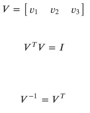 * 정규직교하는 3차원 벡터 $v1, v2, v3$로 이뤄진 행렬 V에 대해서 다음 등식이 성립한다.