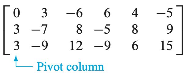 * 첫 번째 row의 첫 번째 entry가 0인 반면 4번째 row의 첫 번째 entry는 3이다. 위치를 바꿔서(Interchange) pivot column의 nonzero entry가 pivot이 되도록 한다.