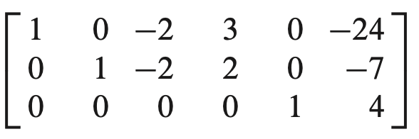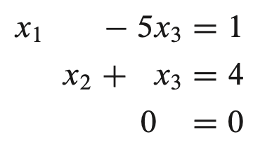 * 위와 같은 linear system이 있다고 해보자(row reduction을 거쳐 reduced echelon form으로 변환된 linear system이다). 변수의 개수보다 equation의 개수가 적기 때문에 무수히 많은 해가 존재하게 된다.