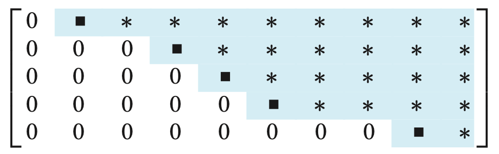 2) nonzero row들의 배열은 다음과 같다 : leading entry의 위치는 바로 위 row의 leading entry보다 오른쪽에 위치한다(동등한 위치도 안된다). 즉, 각 leading entry를 기준으로 column 기준 아래의 값들은 모두 0이어야 한다.
