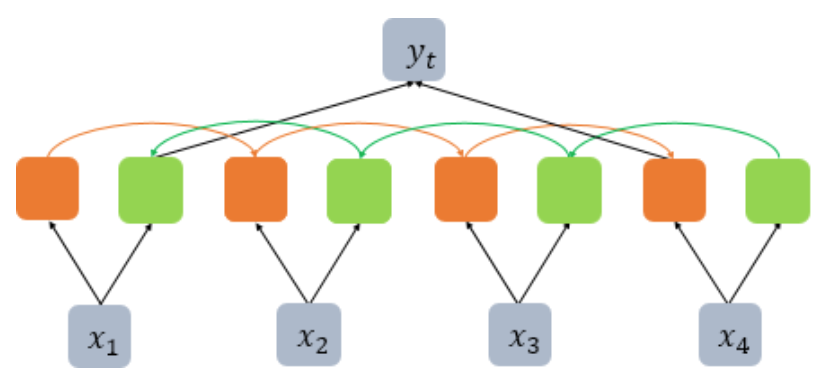 * 만약 위와 같이 return_sequences를 False로 설정하면 return 되는 hidden states는 그림과 같이 마지막 time step의 forward hidden state와 첫 번째 time step의 backward hidden state라는 것을 알 수 있다. 이는 다음 층의 입력으로 사용된다.