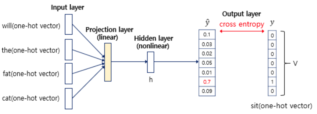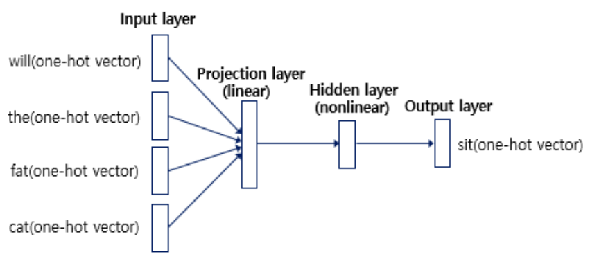 * 만약 'What will the fat cat sit on' 이라는 문장에서 What will the fat cat까지 주어지면 sit이라는 단어를 예측하는 방식으로 훈련된다고 가정해보자. NNLM은 앞에 있는 문장의 모든 단어들을 사용하지 않고 특정 개수의 단어까지만 사용하게 된다. 이를 window라고 한다.여기서는 What을 제외한 will부터의 단어를 예측에 사용한다고 가정해보자.