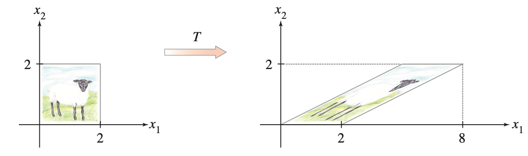 * 두 번째 transformation은 2차원 vector를 2차원 공간으로 transformation하는 경우다. 이러한 transformation을 shear transformation이라고 부른다. shear transformation은 물리학, 지질학, 결정학 등에서 사용되는 개념이다.