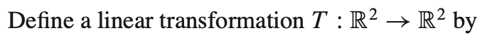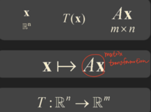 * 어떤 vector의 space를 이동시키는 transformation(function, mapping으로 부를 수도 있음)은 vector x를 $R^n$ space에서 $R^m$ space의 T(x)에 할당하는 것과 같다.